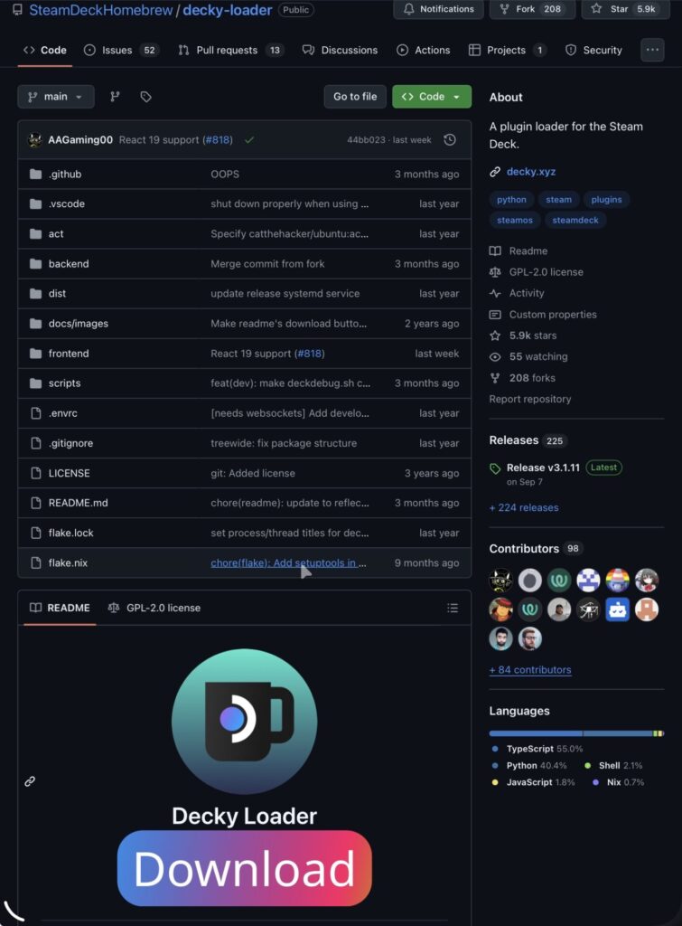 5.Decky Loaderと検索するか下記アドレスでGitHubの対象ページにいくhttps://github.com/SteamDeckHomebrew/decky-loader