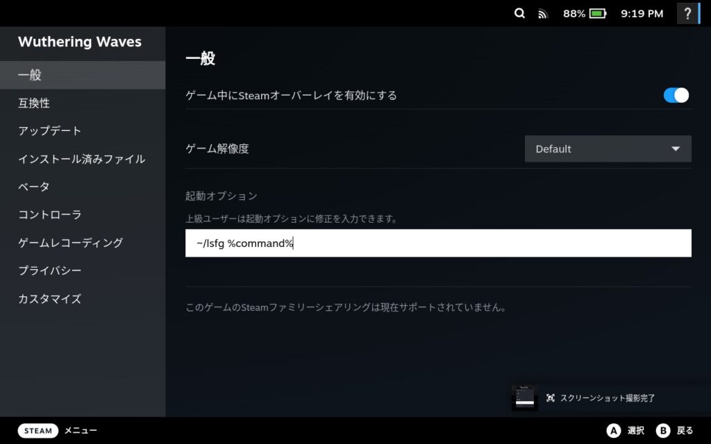 16.起動オプションに「~/lsfg %command%」を入力する (Decky LSFG-VKの「Copy Launch Option」を押すとコピーできるのでそれを貼り付けるだけで大丈夫)