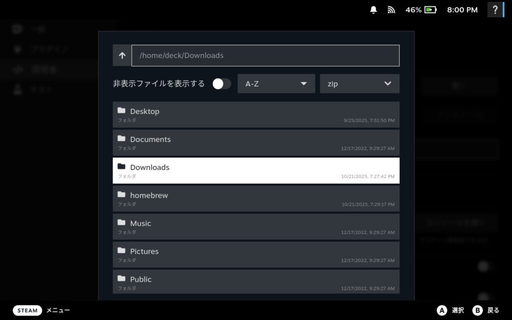 13.4.まででダウンロードしたDecky-lsfg-vk.zipを選択してインストールする