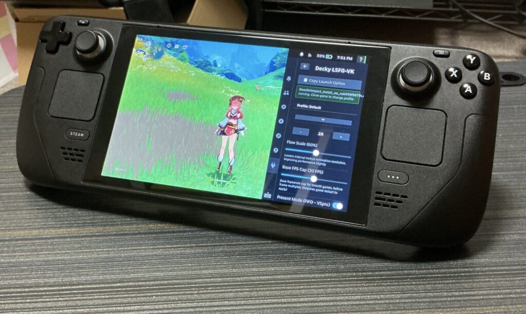 そもそもLossless Scalingってなんなんだよって話なんだけど、要は今流行りの生成AIを使ったアプリで、ゲーム本体で描画された本物のフレームの合間にAIで生成した偽のフレームを挿入することでフレームレートを擬似的に倍増(最大で4倍増までいける)させるアプリ。PCだと他にもアップスケーリングとかあるらしいけどSteam Deckだと今のところフレーム生成しか使えない、らしい。間違えてたら教えてください。